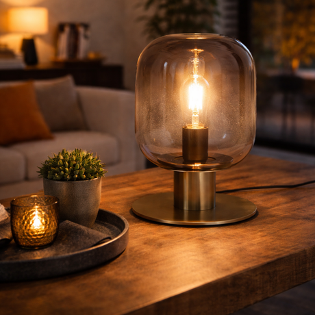 Lune bordlampe - Messing med ravfarvet glas - Integreret lyskilde