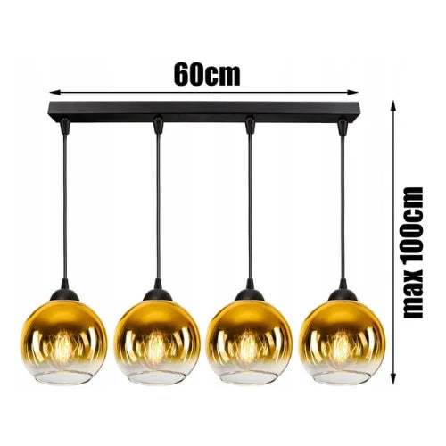 Den aflange, gyldne pendellampe med 4 lyskilder er et luksuriøst blikfang med et varmt udseende. Med sit elegante, aflange design og fire guldfarvede glasskærme er denne lampe perfekt til over et spisebord , en køkkenø eller i stuen .
