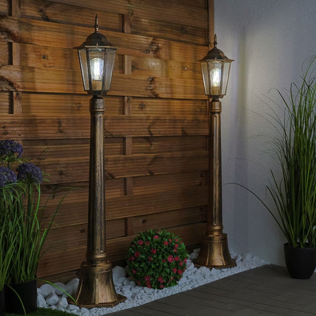Normalpris Adviesprijs :378,00 kr Salgspris 294,00 krEnhedspris /Ikke tilgængelig Havelampe – Lav udendørs lanterne på stang – 1 m høj – E27 – Patina
